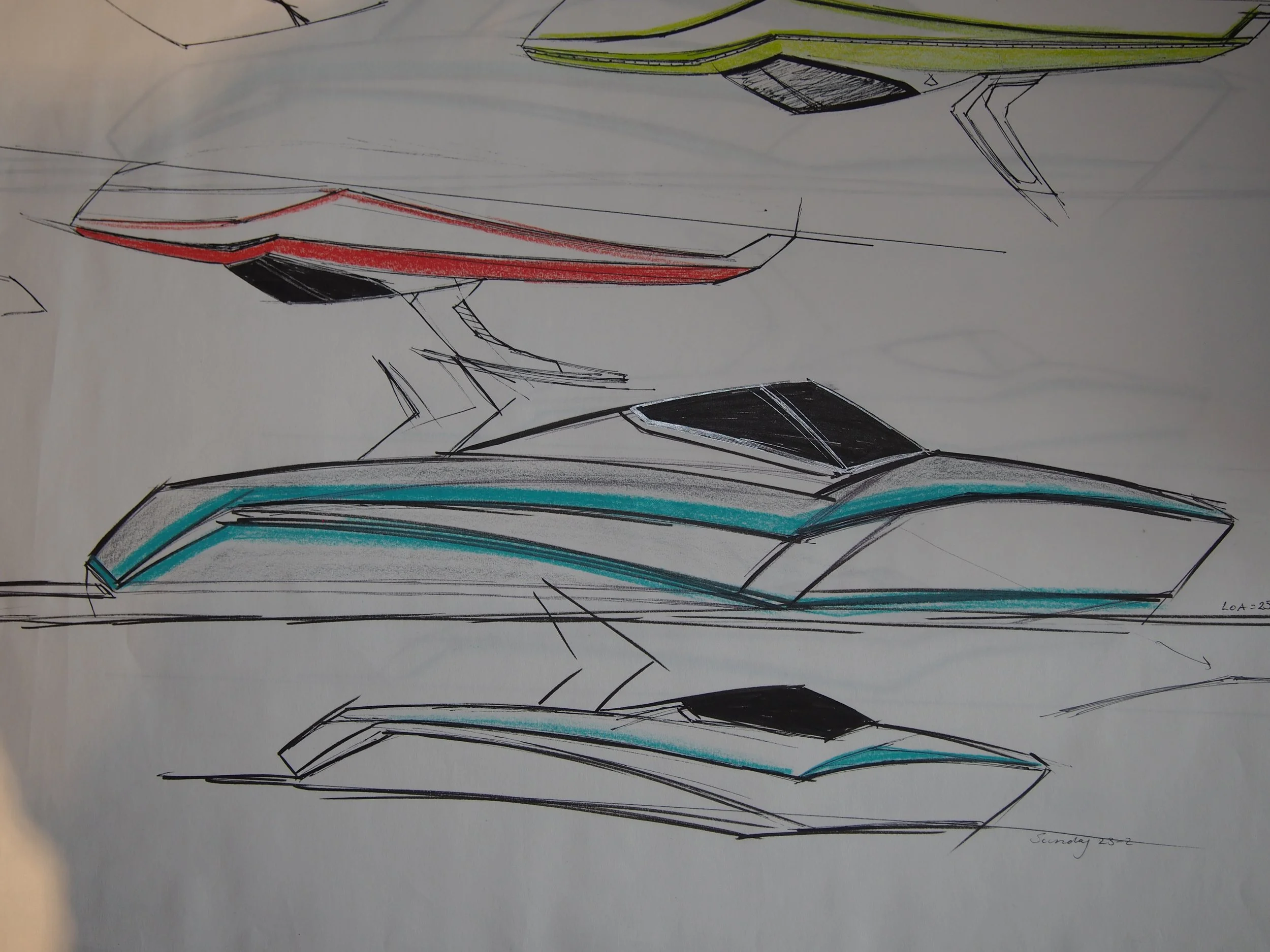 2021 WIP. Wake boat concept pulling some ideas from previous boats but had to have a pickle bow. 32’ LOA, 35’ including the swim platform and a 12’ beam. Twin transverse electric drives coupled to a single pod drive and sub floor batteries would allow a large aft lounge and enclosed head. Finishing out the interior design is next.